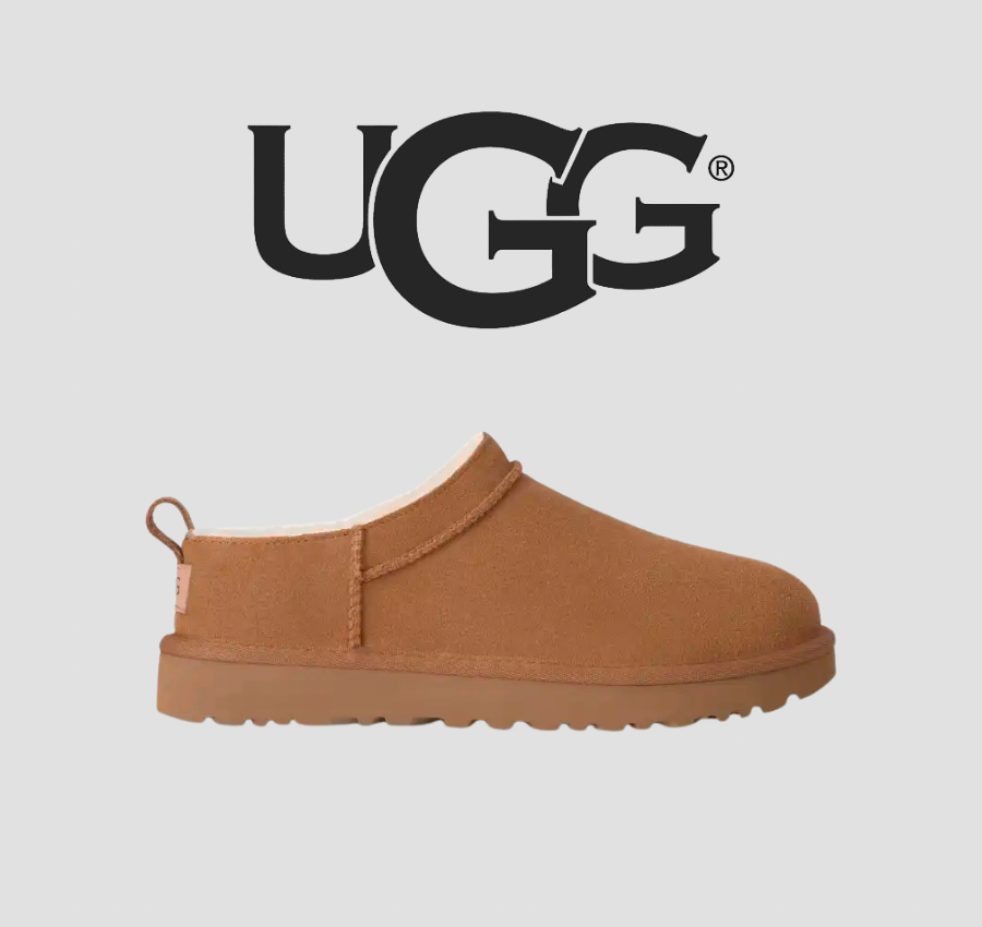 - Etiqueta tejida con logotipo de UGG® en la plantilla y etiqueta de piel con logotipo de UGG® grabado en el talón